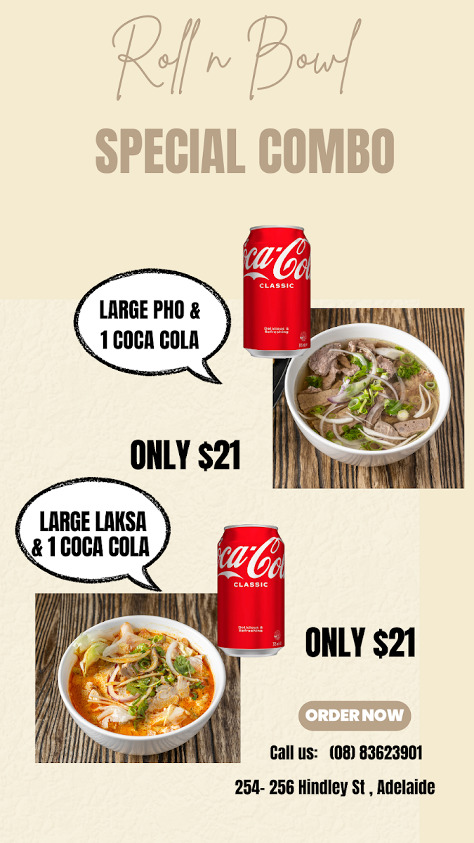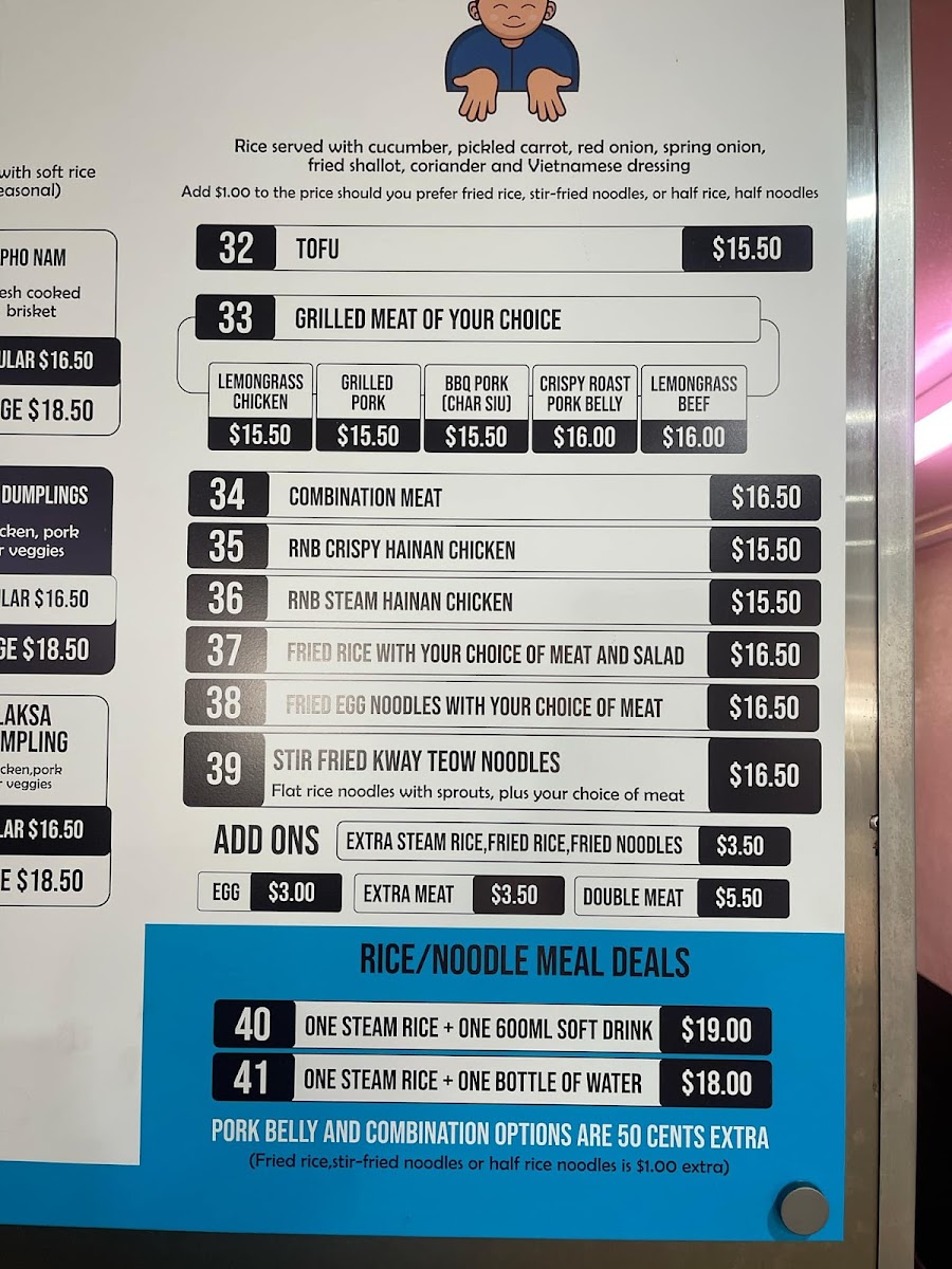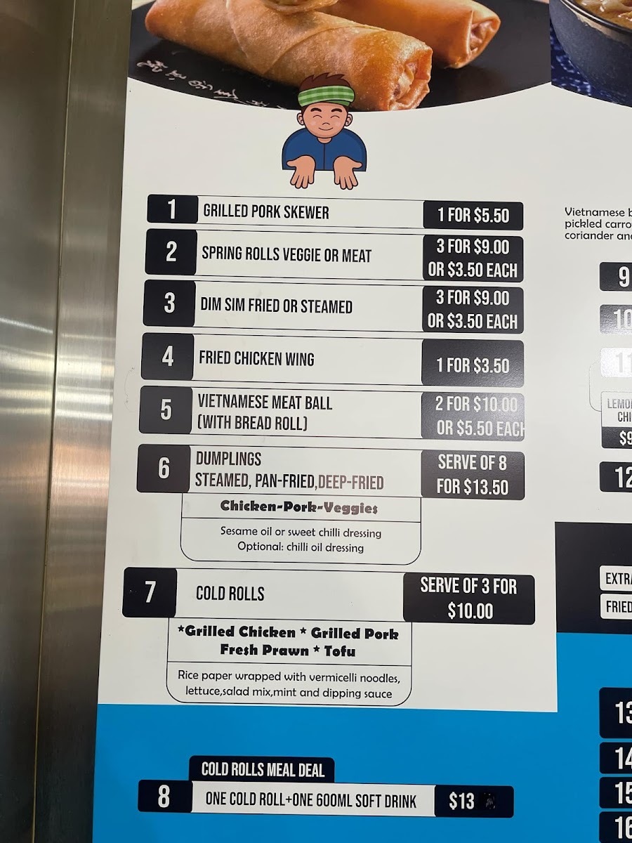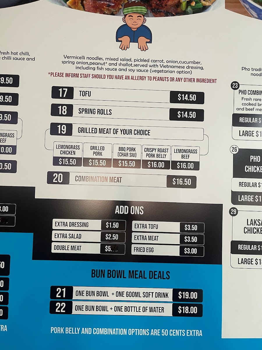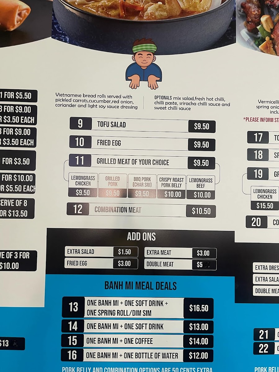 Menu highlights include options like the crispy pork belly banh mi, combination grilled meat rolls, and warming noodle dishes such as chicken dumpling laksa or beef pho. Alongside these are meal deals that mix classics with refreshing drinks, catering to a variety of appetites throughout the day.